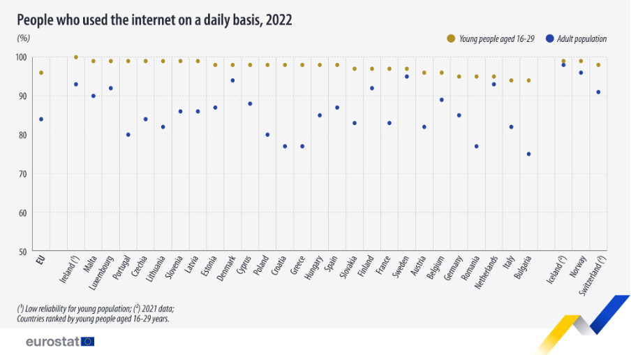 Segons l’estudi d’Eurostat (2022), el 96 % de les persones de 16 a 29 anys fan servir internet diàriament, a la Unió Europea.