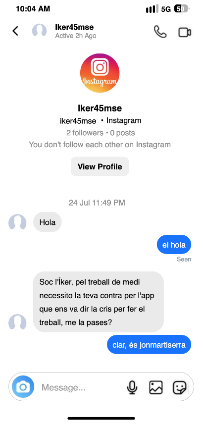 - El desconegut va utilitzar les fotos i la informació compartida per en Jon per crear perfils falsos de dos companys de classe, la Mariona i el Muneeb. Alguns estudiants van rebre missatges insultants i humiliants des d’aquests perfils falsos amb imatges creades amb intel·ligència artificial.